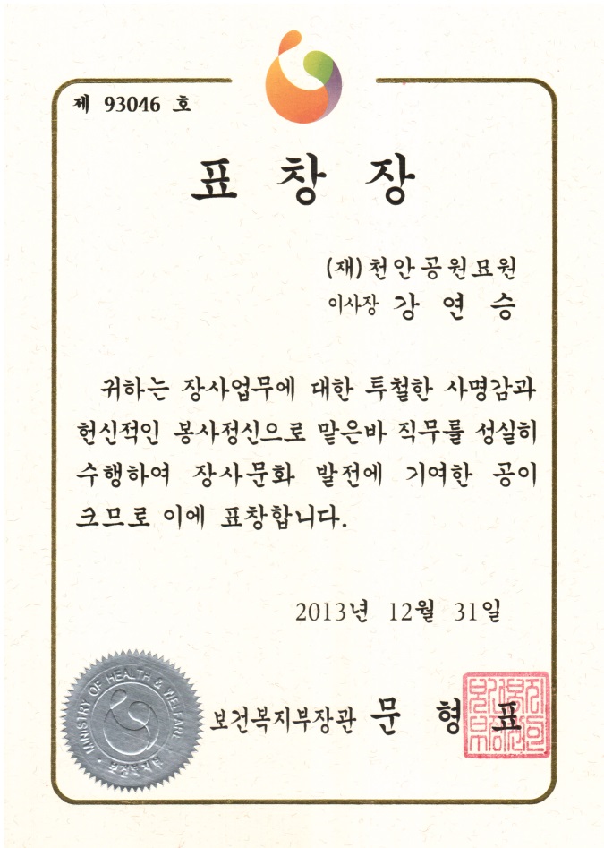 2013년 천안공원묘원이 보건복지부 장관상을 수상하였습니다.